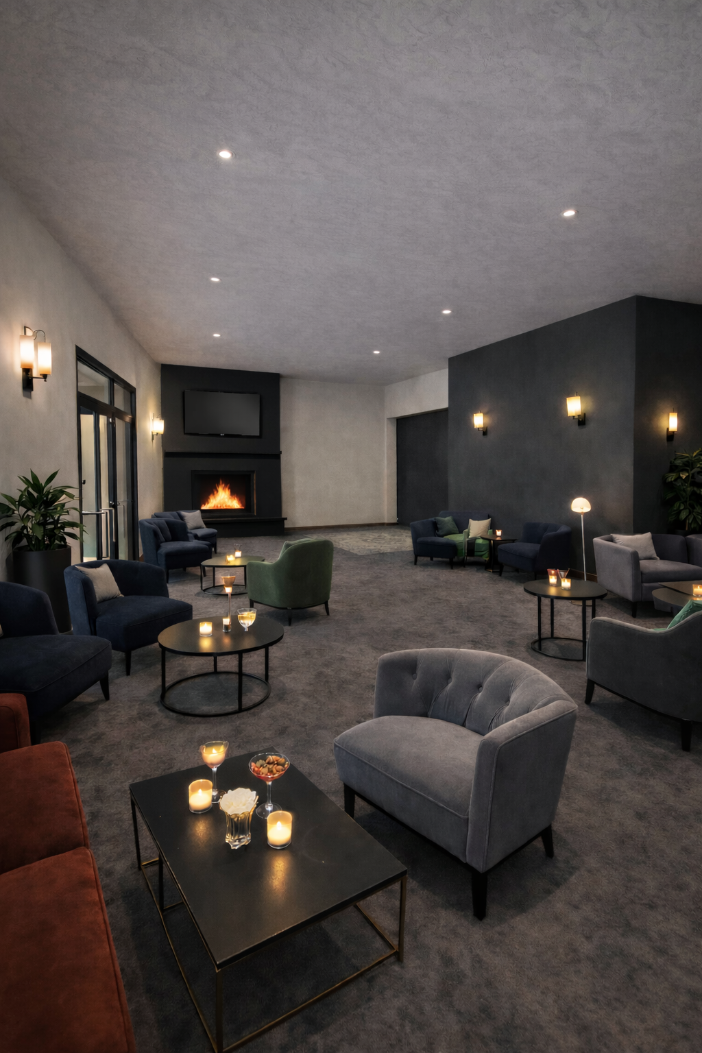 An inviting gathering room often used for cocktail hour, creating a relaxed transition between ceremony and reception with fireside warmth and ambient lighting.